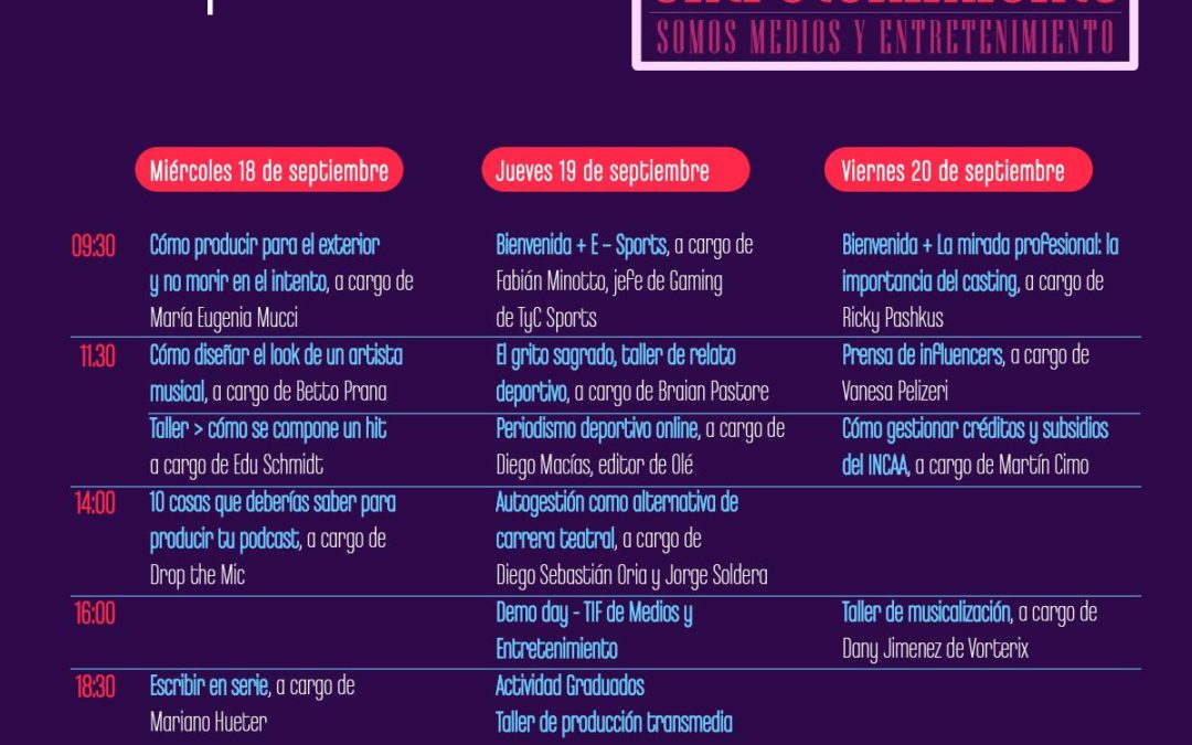 En el marco de esta semana del entretenimiento se dictarán charlas, paneles y talleres abiertos a todo público. Ideales para conocer la licenciatura en Gestión de Medios y Entretenimiento (4 años, 40 materias y practicas) y el Programa Corto de Producción de Espectáculos Artísticos y Musicales (2 años, 16 materias) de la Facultad de Comunicación. Inscripciones mediosyentretenimiento@uade.edu.ar o consultas a www.uade.edu.ar
