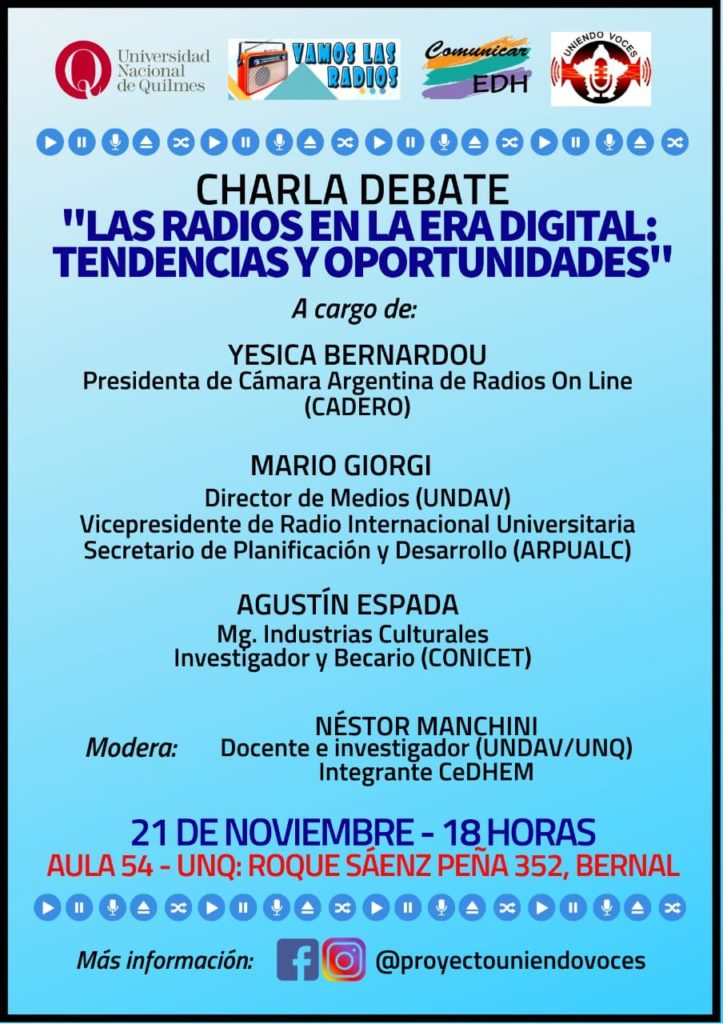 La jornada contará con la participación de asociados de la Cámaras, habrá bandas musicales invitadas, radio abierta, exposición, radios invitadas y una charla Debate donde participará la Presidenta de CADERO, Lic. Yésica Bernardou, junto a Mario Giorgi, Director de Medios de UNDAV, Agustín Espada,Mg en Industrias Culturales, Becario del CONICET, debate que contará con la moderación de Nestor Manchini, Docente e Investigador de UNDAV – UNQ integrante de DEDHEM.